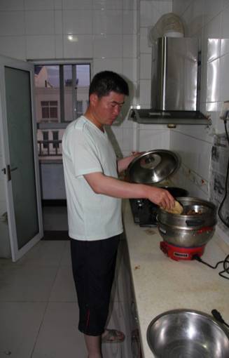 老楊正在準(zhǔn)備早餐 老楊在乘車(chē)站點(diǎn)等待班車(chē)