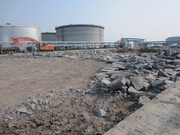 吊裝作業(yè)現(xiàn)場 破道碎石為儲罐打地基