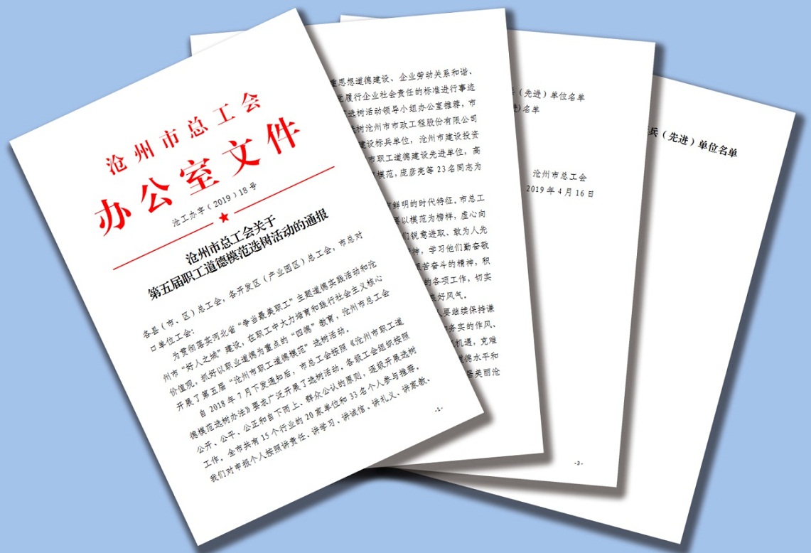 近日,中捷產(chǎn)業(yè)園區(qū)總工會為新啟元公司頒發(fā)了由滄州市總工會授予的“滄州市第五屆職工道德建設(shè)先進(jìn)單位”榮譽(yù)稱號,這是新啟元公司繼榮獲“厚德企業(yè)”、“先進(jìn)職工之家”、“模范職工之家”后的又一殊榮。