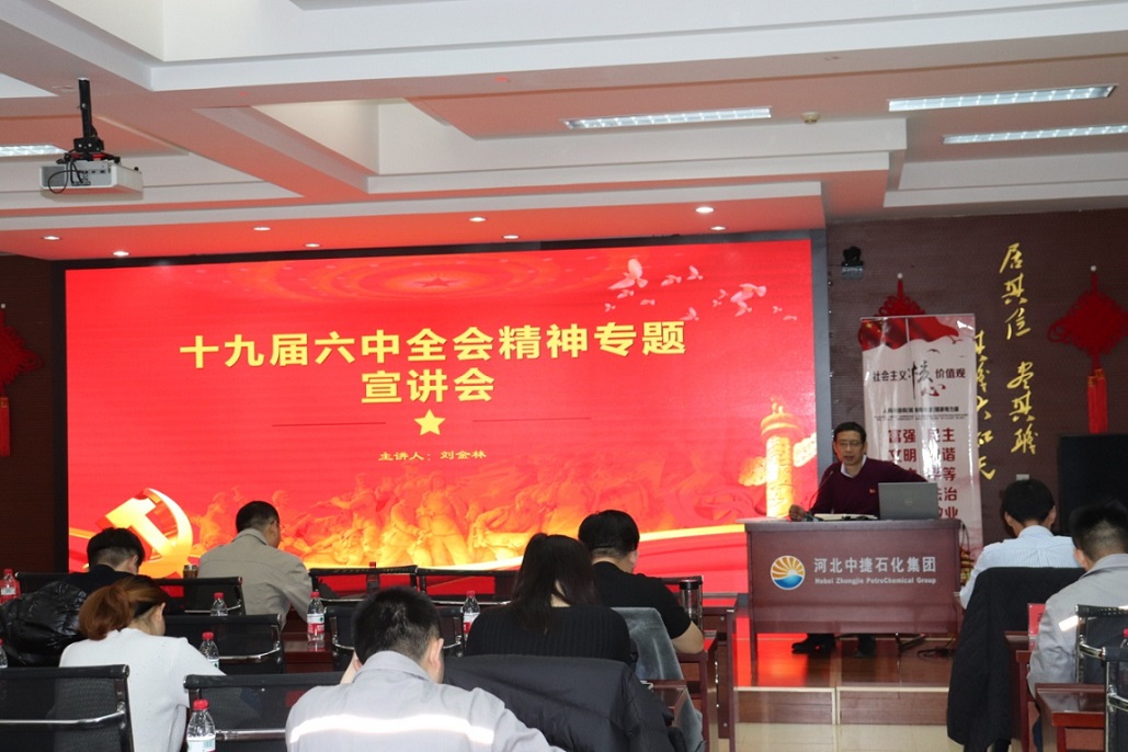 集團(tuán)公司訊 12月10日上午,河北中捷石化集團(tuán)黨委在科研樓六樓會(huì)議室組織舉辦了黨的十九屆六中全會(huì)精神專題宣講會(huì),集團(tuán)黨委書記于國(guó)臣,黨委副書記、紀(jì)委書記朱振江等集團(tuán)領(lǐng)導(dǎo),各黨(總)支部書記、黨員代表共計(jì)40余人參加。宣講會(huì)特邀中捷產(chǎn)業(yè)園區(qū)宣傳部副部長(zhǎng)劉金林主講。