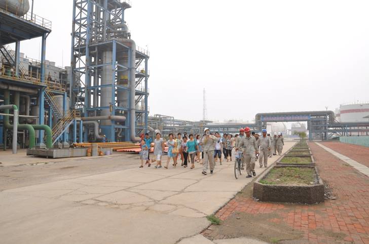 2013年8月4日是公司各級管理人員家屬走進新啟元的日子,上午10:00員工家屬在綜合管理部人員的陪同下來到新啟元,與公司領(lǐng)導(dǎo)共同見證了蒽油反應(yīng)器吊裝的過程,并由各部室負責(zé)人陪同員工家屬繞廠區(qū)參觀,對各裝置情況作了了解。