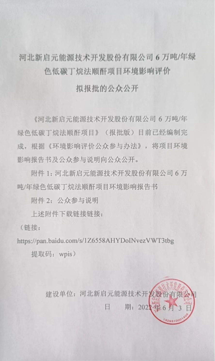 河北新啟元能源技術(shù)開(kāi)發(fā)股份有限公司6萬(wàn)噸/年綠色低碳丁烷法順酐項(xiàng)目環(huán)境影響評(píng)價(jià)擬報(bào)批的公眾公開(kāi)